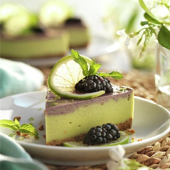 6- Desmolda la tarta, pasando la punta de un cuchillo por los bordes, y déjala 10 minutos a temperatura ambiente. Sirve decorada con la lima restante, lavada y cortada en rodajas, y con las moras reservadas.